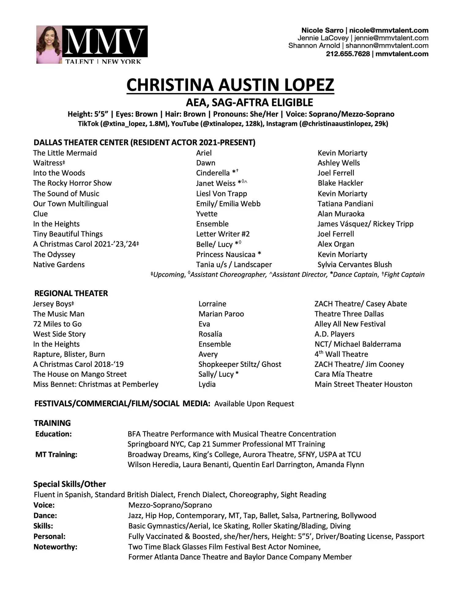 Christina Austin Lopez AEA Actress | Singer | Dancer | Content Creator Headshot & Resume Download Headshot Download Theatre Resume Download Headshot Download Commercial/Film Resume Videos Dance Reel Singing Clips Film/Tv/Commercial Photos Headshots Production Stills Print Work What are people saying?! Read Reviews Here!! Content Creation TikTok Instagram YouTube Download Media Kit Get in Touch! NYC Reps: Nicole Sarro | nicole@mmvtalent.comJennie LaCovey | jennie@mmvtalent.comShannon Arnold | shannon@mmvtalent.comDallas Reps: Rafael Villegas | rafael@kimdawsonagency.comKylie Stevens | kylie@kimdawsonagency.comPersonal Email: christinaaustinlopez@yahoo.com